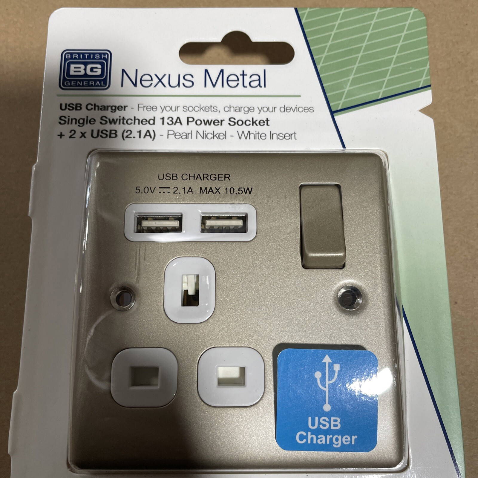 BG pearl nickel 13A switched single socket complete with USB charger X 2